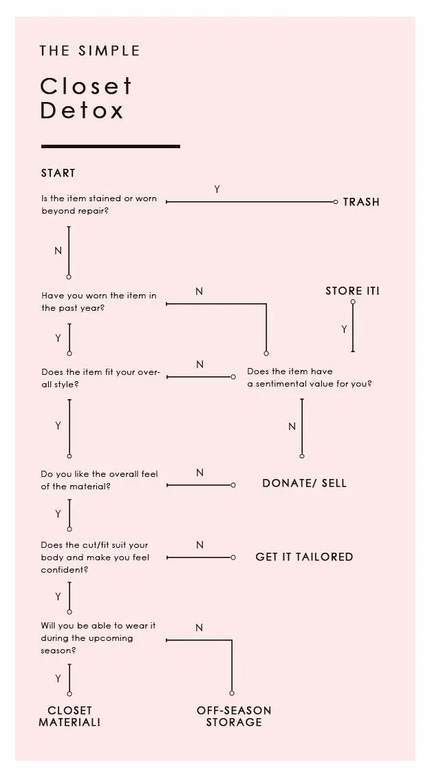 Take every single item out of your closet — yes, everything. Laying your wardrobe out in full view allows you to see the full picture and approach each piece with fresh eyes. Use your bed, a clothing rack, or a clean floor space.